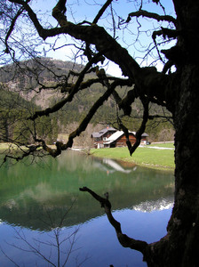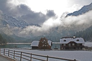 Oostenrijk bergen hellingen kleinarl skiën sneeuw toevlucht winter berg hut meer zon Alpen bomen bos hout verlaat bevriezen spiegel water venster zien beenderen gewei hoorn jacht schedel trofee landschap wolken paard