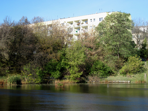 ons portret bomen gazon natuur park recreatie rest schaduwen voorjaar vrije tijd warschau zonnig Polen blokkeren flats gras meer stad vijver water