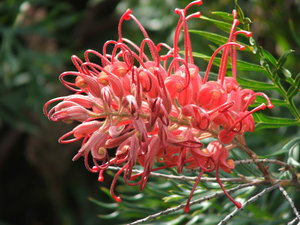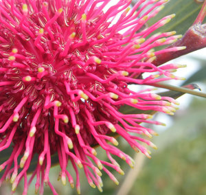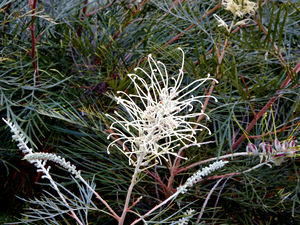 Australisch bal balvormige bloeien bloem bush planten flora groenachtig groenachtig tips heester inlander kleurrijk meeldraad ongebruikelijk ongebruikelijke vorm plant ranken roze struik vreemd zoeken bochtig grevillea kleur loops volle bloei wit rood geel Magnoliopsida beschermd doplets druppels regen water bomen caps capsule clusters conisch drogen eucalypts groen honky noten kap kleuren natuurlijk natuurlijke kleurstof verlaat zaaddozen harige pluizig