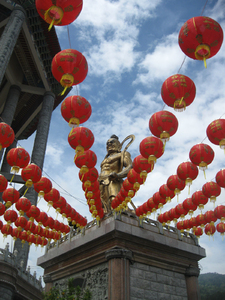 Chinees hond klassiek leeuw sculptuur standbeeld steen voogd beschermen bewaker dier dierentuin horloge mangoest meerkat zoogdier bont geïsoleerd harige knipsel romp staan staren waarnemen Portugal Romaans aanhalen architectuur basis guimaraes kat katachtig kolom natuur bescherming blauw engel hemel krachtig monument rouwende sereen sereniteit treuren verdriet vrede Chinese tempel bronzen standbeeld buiten- dag tijd felle paladin namiddag oosterse schrijn rode lantaarns wolken