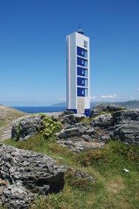 Vuurtoren 1, Galicië, Spanje, blauw, concept, concepten, huis, is, kubiek, kustlijn, licht, liniaal, meer, minimalisme, minimalistische, modern, modernisme, natuur, oceaan, rechthoek, rocks, rots, veiligheid, verlichting, vuurtoren, water, wit