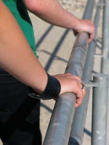 wachten in de rij, buitenshuis, cake, handen, het wachten, lijn, mensen, railing, staand, twee