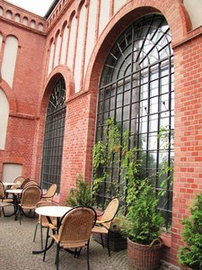 outside patio, bakstenen, buiten, groot, lucht, muur, patio, planten, rood, stoel, stoelen, tafel, venster, vers