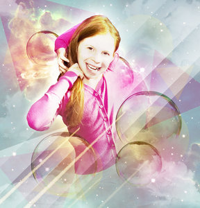 Cosmos Bubble Girl, blauw, chiandra4u, gelukkig, glimlach, hemel, kosmos, meisje, plezier, roze, ster, sterren, zeep, zeepbel