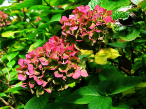 In de herfst van tuin, bloemen, groen, hortensia, hortensia, natuur, plant, planten, rood, roze, struik, tuin