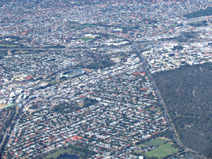 beneden in de buitenwijken, Australië, antenne, arial, auto's, auto's, bekeken, beneden, blauwe waas, bomen, bouw, boven, boven, daken, eigenschappen, gebouwen, groen, groen, grond, hoog, hoogte, huizen, huizen, industriegebieden, kleuren, kleuren, naar beneden te kijken, ontwikkeling, ovalen, panorama-, parken, reizen, rijwegen, rooves, snelwegen, speelvelden, straten, verkeer, vliegend, vliegtuig, vliegtuig, vlucht, voertuigen, voorstads-, voorsteden, voorwaarden, vormen, wazig, wegen, woon-