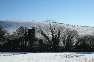 Winter helling, Engeland, Groot-Brittannië, besneeuwd, boerderij, boom, devon, dier, flock, grazen, grazen, grens, helling, heuvel, horizon, landbouw, landschap, natuur, natuurlijk, schapen, sneeuw, vee, veld, verenigd koninkrijk, weide, winter, zoogdier