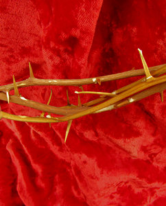 doornenkroon, Christelijk, Christendom, Pasen, bloedrood, doek, doornen, gedraaid, geloof, geloof, goede vrijdag, hoop, hout, houtnerf, kroon, kruisiging, materiaal, netelig, pijn, pijnlijk, religieus, rode doek, rood, scharlaken, scherp, spikes, symbolen, symbolisch, symbool, vlochten