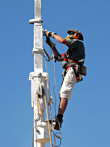 up the mast, ademhalingsapparatuur, ademhalingsmasker, beademingsfilters, gehoorbescherming, gereedschap, gevaar, gevaren, hoog, hoogte, logger, masker, mast, onderhoud, optakelaar, parelend lugger, renoveren, reparaties, risico's, riskant, taai, touwen, tuigage, veiligheid, veiligheidsharnas, veiligheidsuitrusting, verbetering, vernieuwing, werken, werkman
