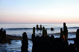 Oude zeewering, golven, hout, is, kust, verdedigingen, zonsondergang