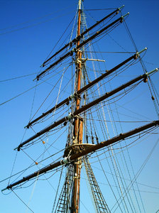 Mast 2, blauw, boot, dundee, hemel, is, lang, masten, navigeren, oceaan, ontdekking, oprollen, opvouwen, reis, riem, schip, touwen, varen, zeilend