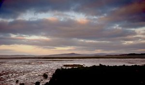 stormachtige bay, bergen, boten, hemel, humeurig, is, kleuren, kustlijn, landschap, storm, wolken, zand