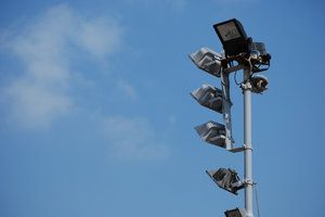Lights on pole, bloembollen, gloeilamp, hemel, licht, lichten, opstapelen, paal, polen, schijnwerper, stadium, verlichting