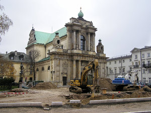 Vernieuwing, bouw, bouwwerken, digger, gebouw, graafmachine, kerk, machines, reparaties, repareren, straat, vernieuwing, warschau, weg, werken