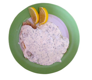Een vis als gerecht, avondmaal, citroen, diner, eten, gekookt, gezond, geïsoleerd, honger, knipsel, maaltijd, plaat, platen, sap, saus, schotel, smakelijk, vis, voedsel, yoghurt