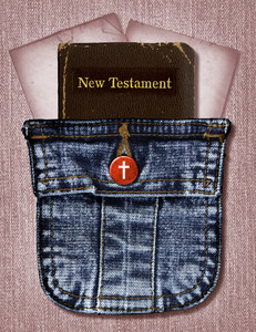 Pocket Bible 2, Bijbel, Christelijk, boek, collage, denim, geloof, heilig, icon, jean, jeans, knop, oud, oversteken, plakboek, redding, religie, religieus, testament, wijnoogst, zak