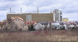 Factory op veld, bedrijf, blokkeren, dorp, fabriek, flats, gebouw, handel, huis, huizen, industrieel, kantoor, ramen, reusachtig, veld