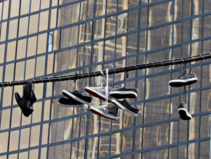 stad schoenen schorsing, achtergrond, achtergrond, boven het hoofd, centrale stad, contrast, contrasterende, divers, gebouw, gekleurd, gekleurd, gevangen, glazen wand, gympen, hangend, hangend, kantoorgebouw, kleur, kleur, kleuren, kleuren, lijntje, los, muur, opknoping, paar, pairs, powerlines, ramen, reflecties, schoenen, stad, straat, variëteit