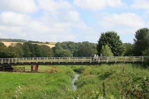 Voetbrug, Engeland, Groot-Brittannië, brug, horloge, landelijk, landschap, lopen, mensen, moerassig, natuur, natuurlijk, platteland, rivier, staan, staren, stroom, sussex, voetbrug, voetgangersbrug, vrije tijd, wandelen, weide, zien, zomer