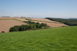 Hilly fields, Engeland, Groot-Brittannië, boerderij, gewas, grens, groen, heuvel, landelijk, landschap, sussex, veld, vrede, zien, zomer