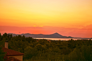 before nightfall, bergen, bomen, huis, is, natuur, oranje, wolken