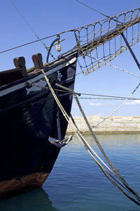 Oude zeilschip, Cyprus, Girne, aangemeerd, anker, haven, historisch, jacht, kyrenia, mast, oud, oude, schip, touw, voorsteven, water, zeilend