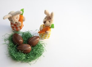 Paashazen 1, Christelijk, Pasen, Pasen, Vrolijk Pasen, achtergrond, april, behandelen, bruin, cacao, cadeau, chocolade, decoratie, eieren, feestdag, groen, groeten, heerlijk, helder, kleur, konijntje, konijntjes, kralen, mand, marionet, mooi, nest, objecten, ronde, seizoen-, snoep, stro, viering, vlechtwerk, voedsel, voorjaar, zoet