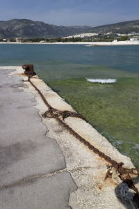 Harbour wall, Italië, baai, bollard, echter, golf, haven, heuvel, is, keten, kustlijn, muur, vandaag, water