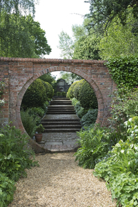Garden circle, Engeland, Engels, Groot-Brittannië, baksteen, circulaire, cirkel, gat, groen, hampshire, kenmerken, muur, oculair, ontwerp, pad, planten, schaduw, schaduwrijk, tuin, voorjaar