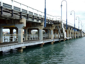 doubledecker Bridge3, architectuur, balken, barrières, beneden, beton, bewolkt, bouwkundig, boven, breed, brug, buitenkant, communie, contrast, contrasterende, dek, dekken, extern, hoeken, hoekig, hout, lang, lichten, onderscheidend, ondersteunen, open, overbrugging, railing, rails, staal, sterk, toegang, toegankelijk, uitgestrektheid, verkeer, verlichting, verschijningen, visvangst, voertuigen, voetgangers, water, wolken