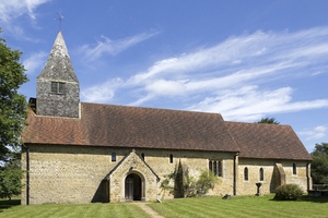 Surrey kerk, Christelijk, Engeland, Engels, Groot-Brittannië, architectuur, dak, door, entree, gate, kerk, landelijk, ramen, religie, religieus, steen, steunpilaar, surrey, tegels, torenspits, torenspits