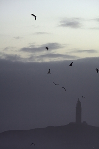 de zwarte toren, Coruña, Galicië, Hercules, Romaans, Romeins, Spanje, architectuur, blauw, coruna, erfgoed, grijs, hemel, huis, is, jaren, kust, licht, natuur, oceaan, ochtend, oud, oude, schiereiland, structuur, toren, vuurtoren, water, wereld, wolken, zonsopgang, zwart