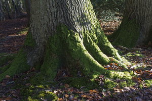 eiken boomwortels, Engeland, Engels, Groot-Brittannië, Quercus, bomen, bos-, eik, groen, mos, mossig, natuur, natuurlijk, platteland, romp, roots, schaduw, schors, sussex, winter, zonlicht