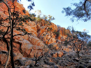 rocky hillside4, Australië, binnenland, binnenlands, blauw, bomen, bruin, centraal australië, desert-regio, drogen, geul, heet, heldere hemel, hemel, heuvel, hoog, hoogte, loof, rocks, rotsachtig, ruig, ruw, schrobben, struik, struiken, struikgewas, texturen, vegetatie, veld, woestijn-land, zonlicht, zonneschijn