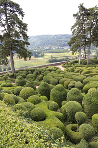 topiary en belvedère, Dordogne, Frankrijk, Frans, abstract, afgekapt, afgelegen, afstand, bal, belvedere, doos, gevormd, groen, heester, muur, pad, park, struik, topiary, tuin, zien