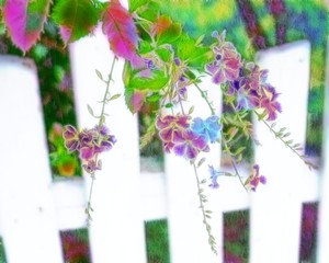 wit hek en bloemen 3, blauw, bloemen, buitenshuis, ecologie, grafisch, groen, illustratie, kleur, kleuren, mooi, natuur, omheining, ontwerp, purper, roze, schets, scrapbooking, tuin, tuinieren, verlaat, voorjaar, vrij, wit, zomer