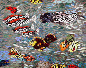 mozaïek fish2, abstract, achtergrond, actie, actief, afbeelding, artistiek, beeltenis, beetjes, chips, contrast, contrasterende, gechipt, gekleurd, gekleurd, grouting, horizontaal, interlaced, is, kapot, kleur, kleur, kleuren, kleuren, kunstwerk, met elkaar verbonden, mozaïek, onderling verbonden, onregelmatig, ontwerp, ontwerpen, oppervlak, oppervlakken, patronen, tegels, uitdrukking, verschijning, verweven, verweven, vis, vorm, vormen, water, zwemmen