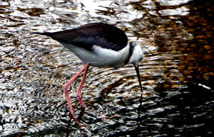 maken ripples1, Australisch, Longshanks, Steltkluut-, carnivoren, dog-bird, dun, foerageren, ingesteld, kabbelend, langbenige, pied stilt-, reflecties, rimpelingen, stroom, vleesetend, vogel, waden, wader, water, water-bird, white-headed-steltenlopers