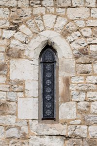 smal kerkvenster, Christelijk, Engeland, Engels, Groot-Brittannië, architectuur, communie, kerk, klein, muur, religie, religieus, smal, steen, surrey, traditioneel, venster