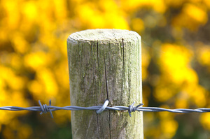 hek post, apart, draad, gaspeldoorn, geel, hout, houten, metalen, omheining, omsluiten, ondersteunen, post, prikkeldraad, streng, velden