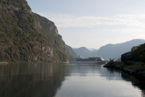 fjord cruiser, Noors, Noorwegen, bergen, draai, fjord, kruiser, licht, manoeuvre, meer, ochtend, reflecties, schip, sognefjord, toerisme, voering, vroeg, water