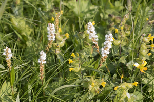 arctische wilde bloemen, Noors, Noorwegen, Polygonum, arctisch, bloemen, geel, groen, ratelaar, weide, wild, wit, zomer