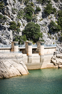 dam, Majorca, Spanje, aquamarijn, architectuur, balearen, berg, beton, blauw, bomen, dam, geblokkeerde, hard, hard, meer, natuur, planten, rimpelingen, rots, rotsachtig, sober, torens, vegetatie, verstopping, water, wit, zien