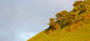 levendige helling, aardlaag, avond, bomen, copyspace, gaspeldoorn, gras, groen, groen, helder, helling, heuvel, levendig, rocks, steil, struiken, weide, zonneschijn