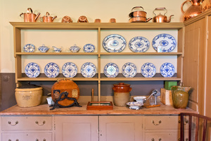 oude keuken, Engeland, Engels, Groot-Brittannië, Interieur, aardewerk, commode, historisch, huishouden, keuken, koper, nationaal vertrouwen, norfolk, oud, periode, platen, schappen